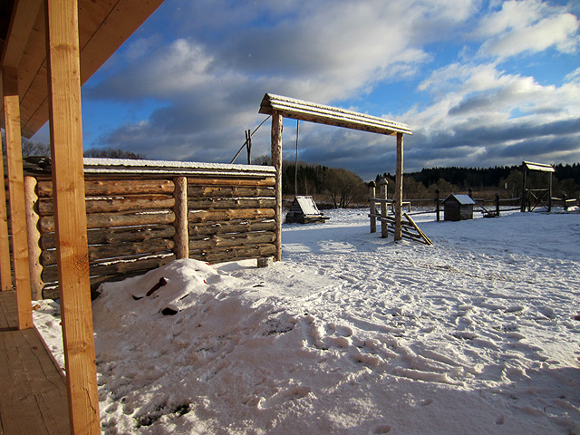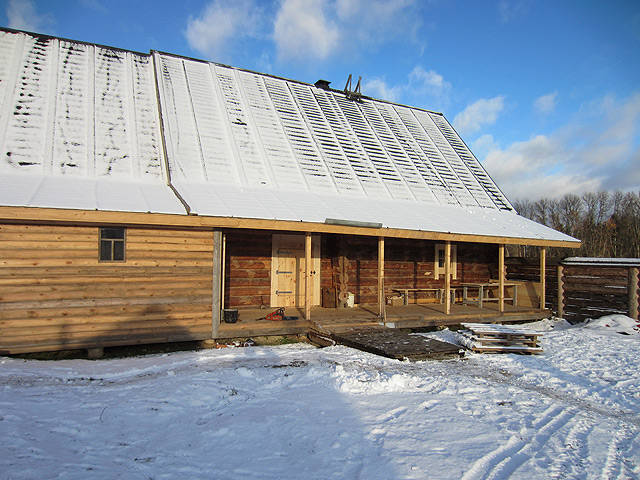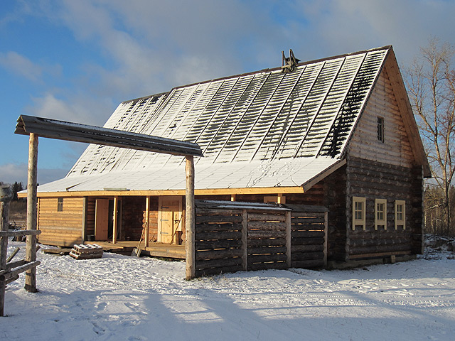 Строительство новой избы. Осень-зима 2011 года. К наступлению холодов нам удалось сделать все необходимое, чтобы продолжить отделочные работы в самой избе в зимнее время. Была сложена русская печь, вставлены окна и двери, утеплен потолок, покрашены полы, сделаны скамьи да лавки. ![]() © 2006-2011, ООО «Доронино».