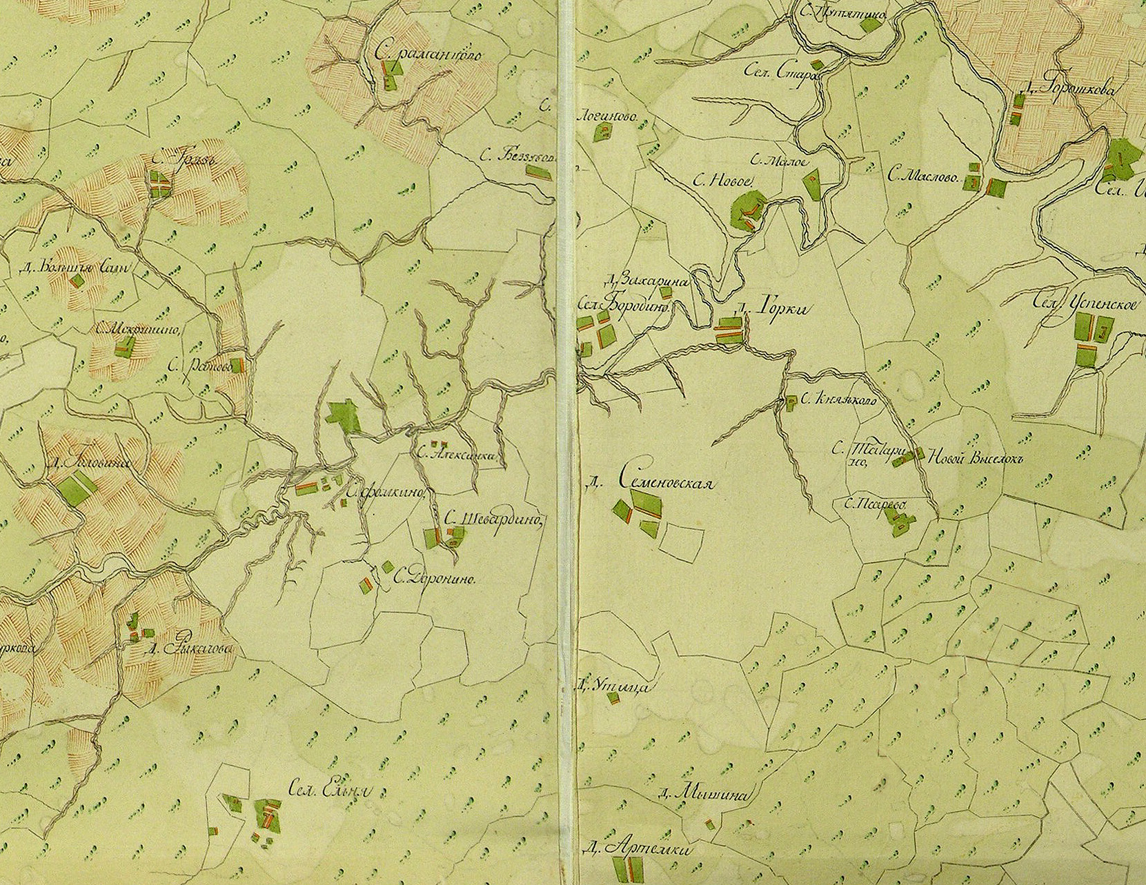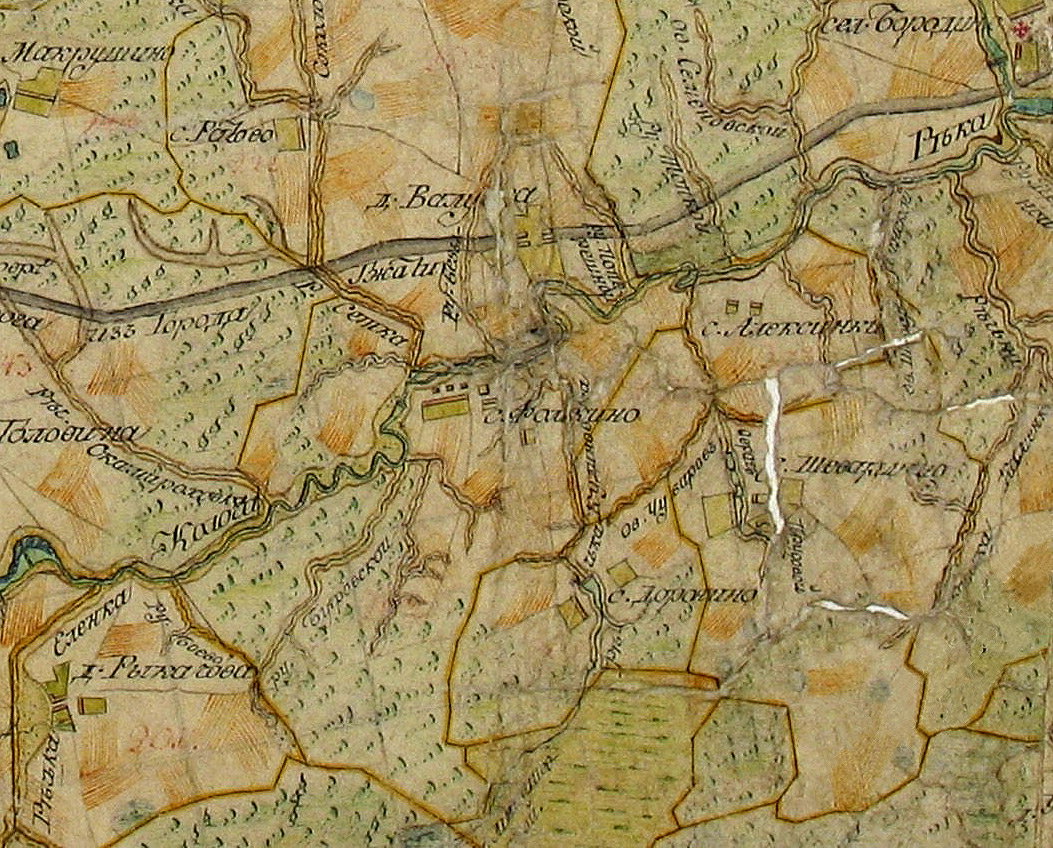 Доронино и окрестности на межевых, военных и географических картах План генерального межевания 1790-е гг. На межевом плане прекрасно видно, что сельцо Доронино располагалось по обеим берегам речки Кудиновки, запруженной плотиной. Отчетливо виден проточный пруд, образованный этой плотиной.