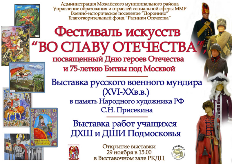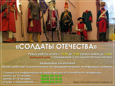 11 ноября 2014 г. Специально для сайта нашего живого музея РОО «Академия русской символики «МАРС» разработала электронную on-line викторину «Русские пословицы и поговорки». Участвуйте и покажите всему миру свои знания и смекалку! 30 октября 2014 г. Открыт благотворительный счет для пожертвований граждан и организаций на строительство памятного знака «Летчикам-истребителям - защитникам неба Москвы и Подмосковья». 21 октября 2014 г. В программе «Прогулки по Подмосковью» на радиостанции «Наше Подмосковье» принял участие В.И. Петров - руководитель военно-исторического поселения «Доронино», который рассказал о проекте памятного знака мл. лейтенанту В.В. Силантьеву и живом музее «Доронино». 9 октября 2014 г. Хроника создания памятного знака «Летчикам-истребителям - защитникам неба Москвы и Подмосковья». 3 октября 2014 г. Живой музей «Доронино» совместно со своими друзьями и партнерами готовится достойно встретить 70-летие Великой Победы советского народа над фашистской Германией. На протяжении нескольких лет мы создавали экспозицию, посвященную обороне Москвы в октябре 1941 года на Можайском рубеже, вели поисковую и научно-исследовательскую работы. Результатом этих усилий должны стать создание, установка и открытие ко Дню Победы Памятного знака «Летчикам-истребителям - защитникам неба Москвы и Подмосковья» (в память подвига летчика 172-го истребительного авиационного полка резервной авиагруппы полковника Сбытова, младшего лейтенанта Силантьева В.В., 19 февраля 1942 года совершившего воздушный таран над Бородинским полем). 29 сентября 2014 г. Нашим музеем совместно с ТК «Отечество» разработана новая туристическая программа «На можайском рубеже», посвященная 70-летию Великой Победы. 30 июля 2014 г. РОО «Академия русской символики «МАРС» совместно с интернет-проектом «1812 год» и живым музеем крестьянского и военного быта «Доронино» начали сбор благотворительных средств на выпуск оригинального USB-носителя («флешки») с интерактивной викториной для детей и взрослых «От Москвы до Парижа с русской армией». ![]() Призываем поддержать проект!