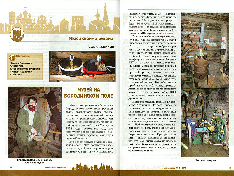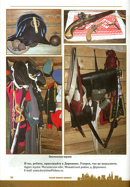 Научно-популярный журнал для детей и юношества «Юный краевед», №1, 2010 год. Музей своими руками Музей на Бородинском поле Мне часто приходится бывать на Бородинском поле, поле русской славы, обагренном кровью, где наше воиство стало стеной перед «грозным французом». Люблю эти места, где можно ощутить героический дух, царивший здесь 26 августа 1812 года, вспомнить тех, кто «послужил верой и правдой до последней капли крови», защищая родное Отечество. Вот и совсем недавно я вновь оказался здесь. Мне посчастливилось увидеть музей, в котором история оживает! О нем я и хочу рассказать нашим читателям. Музей находится в деревне Доронино, что неподалеку от Шевардинского редута. Здесь 24 августа 1812 года располагались егерские полки, отражавшие атаки поляков Понятовского на Доронинско-Шевардинские позиции. Главная особенность музея состоит в том, что все предметы и детали интерьера оступны в повседневном обиходе - их разрешено брать в руки, расматривать, фотографировать. Переступив порог крестьянской избы, мы погружаемся в атмосферу жизни крестьянской семьи XIX века - огромная печь, деревянные лавки, образа. В таких простых избах квартировали воинские части русской армии, поэтому есть возможность узнать и походную жизнь русского солдата, даже отведать солдатской каши. Эта обстановка приближает к событиям, происходившим на территории Можайского уезда в Отечественную войну 1812 года, и позволяет почувствовать их драматизм. И все это создано руками Владимира Ивановича Петрова, директора музея, человека неординарного, увлеченного. В доброй, спокойной беседе он рассказал мне, как родилась идея музея, как он создавался и каковы перспективы его развития. Ребята музей любят, часто посещают его, ведь здесь есть возможность ощутить священную землю Бородинского поля. При расставании я сказал Владимиру Ивановичу, что мой визит сюда не последний. Мы обязательно встретимся, и он расскажет нам о своих удивительных находках. И вы, ребята, приезжайте в Доронино. Уверен, что не пожалеете. Адрес музея: Московская обл., Можайский район, д. Доронино. Сергей Иванович Савинков, Источник: ![]() © 2010, ООО «Доронино».